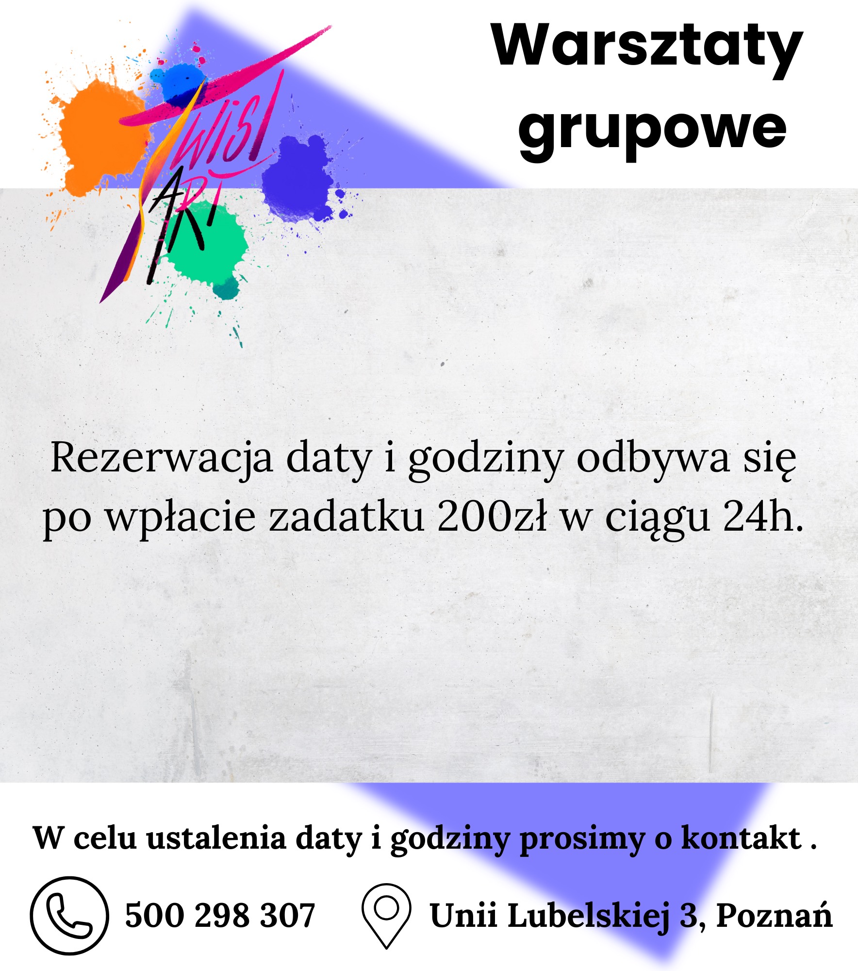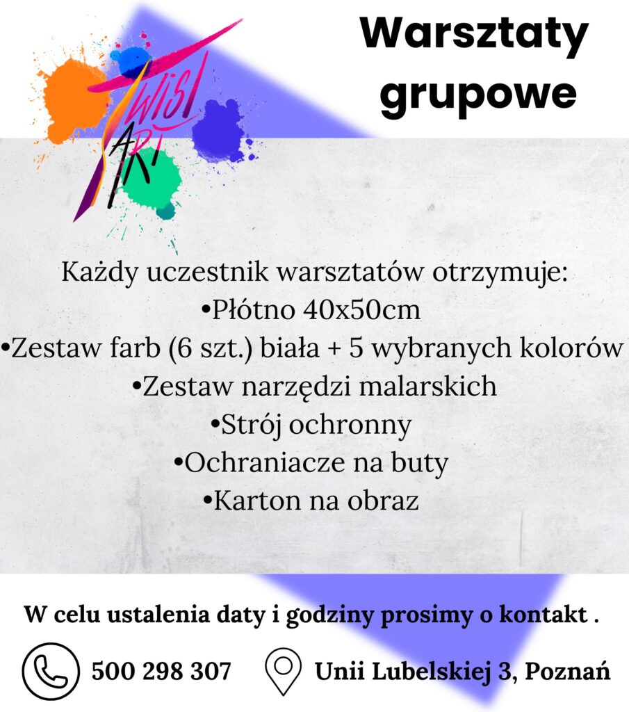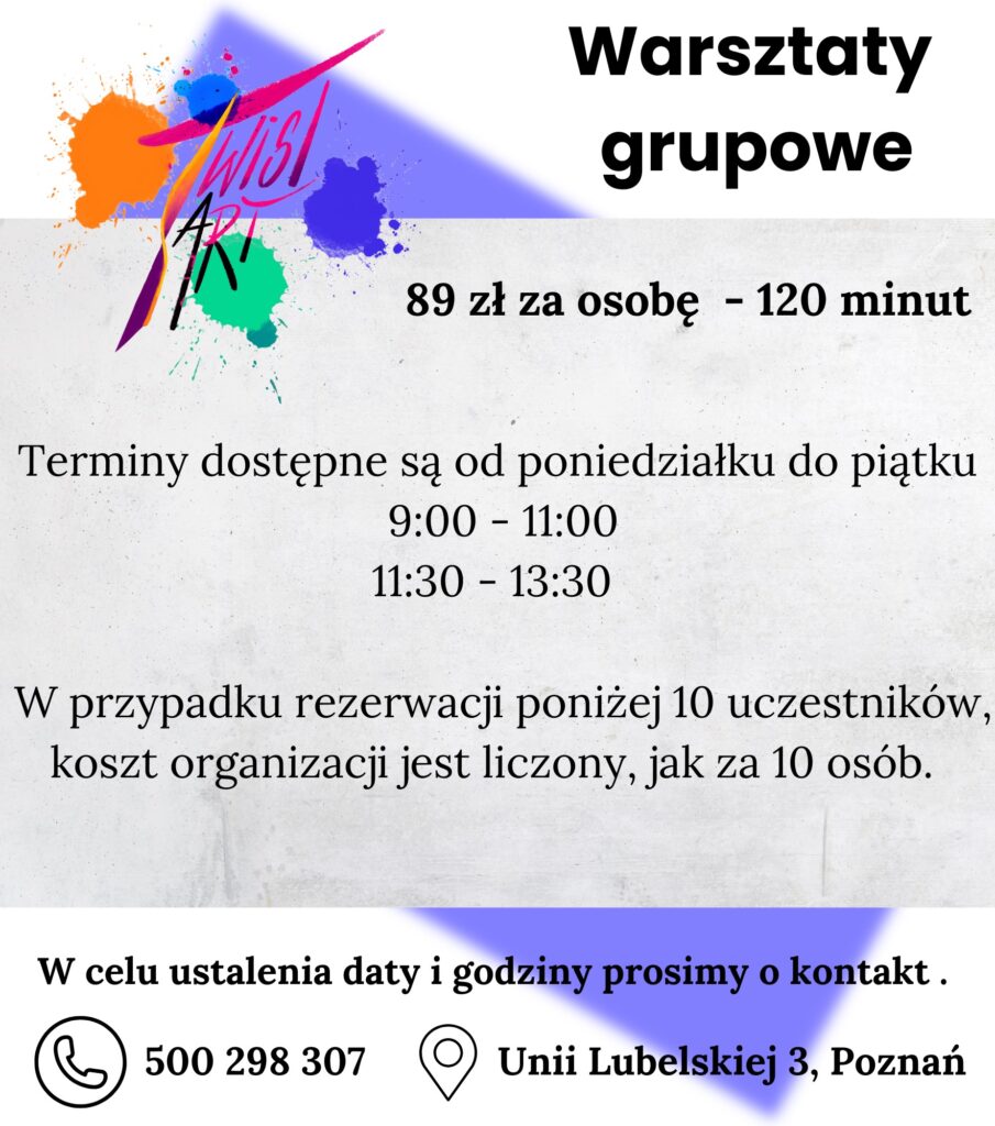 Nie potrzeba żadnych umiejętności artystycznych – liczy się dobra energia i chęć spróbowania czegoś nowego! Na koniec każdy z uczestników wychodzi z własnym, unikalnym dziełem, a cała grupa z głową pełną pozytywnych wspomnień.